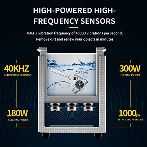 ?3 Industrial Grade Ultrasonic Transducers (3x60W=180W)?Featuring advanced transducer technology, this ultrasonic cleaners provides a thorough cleaning process for your valuables and small items. It generates 40kHz ultrasonic vibrations that create cavitation bubbles, gently removing dirt in minutes without damaging your valuables. Voltage: 110V. Heating power: 300W.
