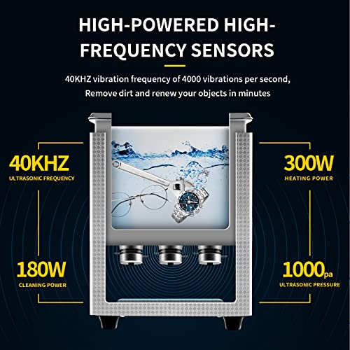 180W ultrasonic + 300W heating: 3 ultrasonic transducers built-in (3 x 60 W = 180W) and a 300W heater make it easy to thoroughly clean your valuables and small items. The ultrasonic cleaner produces 40kHz ultrasonic vibrations that create cavitation bubbles for 360° deep cleaning of every inch of the surface, gently removing dirt in minutes without damaging your valuables. Voltage: 110V.