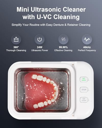 Compact Ultrasonic Retainer Cleaner: Boasting 24W power and a 200 mL (6.7 fl. oz.) volume, this ultrasonic denture cleaner is the ideal solution for removing stains and buildups from delicate items like jewelry, toothbrush heads, dentures, and more!