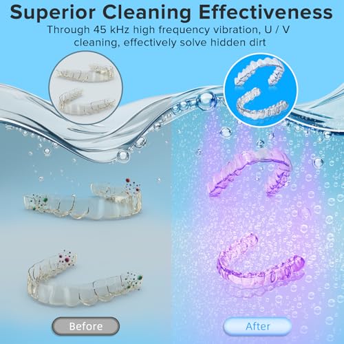 ?45kHz Ultrasonic Deep Cleaning?The ultrasonic retainer cleaner uses 45,000Hz high frequency sound waves to penetrate into crevices and grooves, covering 360° to net through dirt and effectively remove particles/dirt from dentures, retainers, mouth guards, jewelry, etc. without damaging delicate items