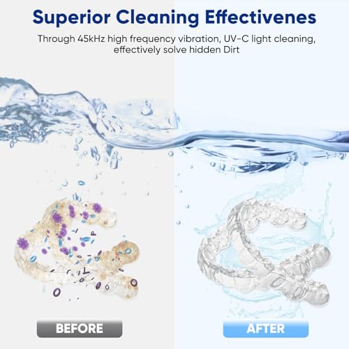 Advanced Ultrasonic Technology?The ultrasonic retainer cleaner employs high-frequency 45kHz sound waves, effortlessly removing dirt from retainers, mouth guards, and dental appliances, reaching all the hard-to-clean corners and crevices without causing any harm to them,offering 360°comprehensive stain removal