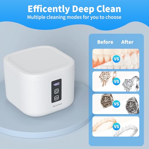 [6 Cleaning Modes ] The ultrasonic cleaner retainer offers 6 modes to match different cleaning needs. 6 customizable UV light cleaning modes to suit different items (3/5/8 Min). For a deeper clean, use with retainer cleaner 48kHz cleaning to remove tough stains effectively.